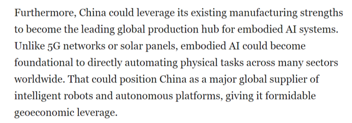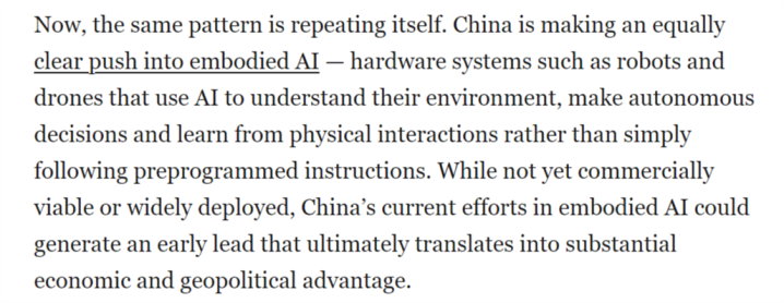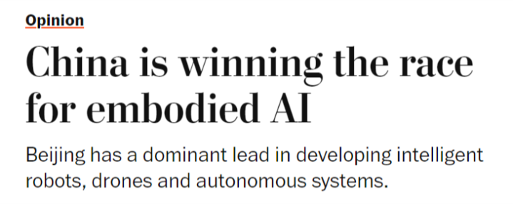 《华盛顿邮报》报道截图 文章表示,如今,同样的模式正在重新上演。中国正以同样明确的力度进军具身人工智能领域——即机器人、无人机等硬件系统利用AI感知环境、自主决策并从物理交互中学习,而非仅执行预设指令。尽管尚未实现商业化或大规模部署,但中国当前在具身人工智能领域的努力可能使其取得早期领先,并最终转化为显著的经济与地缘政治优势。 文章指出,发展人工智能驱动的机器人是中国的科技政策优先事项之一,具身人工智能被写入中国“十五五”规划建议中,被定位为到本世纪30年代初中国经济增长的一大新引擎。